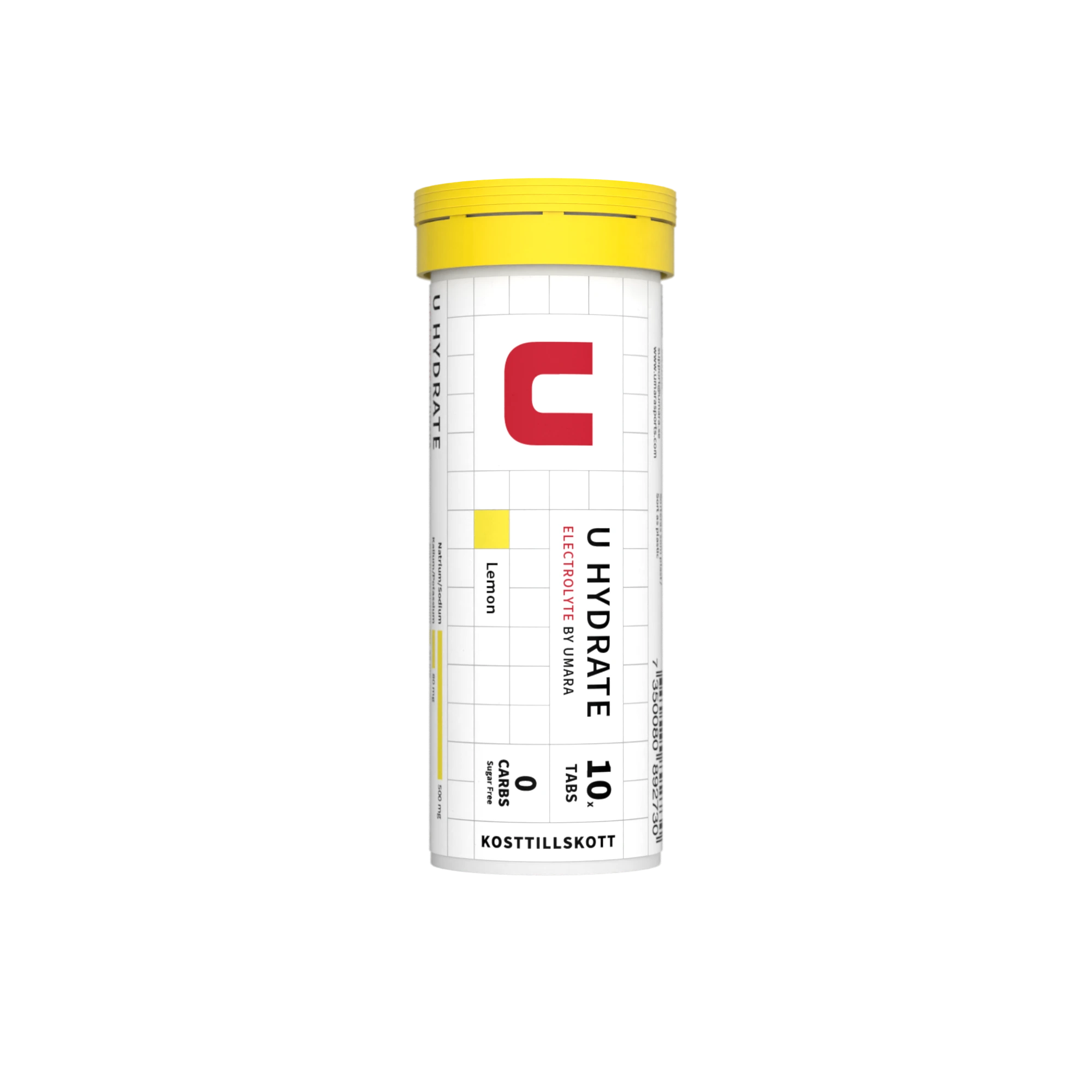U Hydrate är våra goda brusande elektrolyttabletter där varje tablett innehåller Natrium, Kalium, Kalcium och Magnesium motsvarande de halter vi svettas ut via 0,5 liter svett. U Hydrate är kalorifria/kolhydratfria och passar för träningspassen där du vill träna utan energi, eller under pass där du bara vill ha en fräsch god smak på vätskan i flaskan. Tabletterna har även en brytskåra i mitten ifall du vill ta en halv dos.