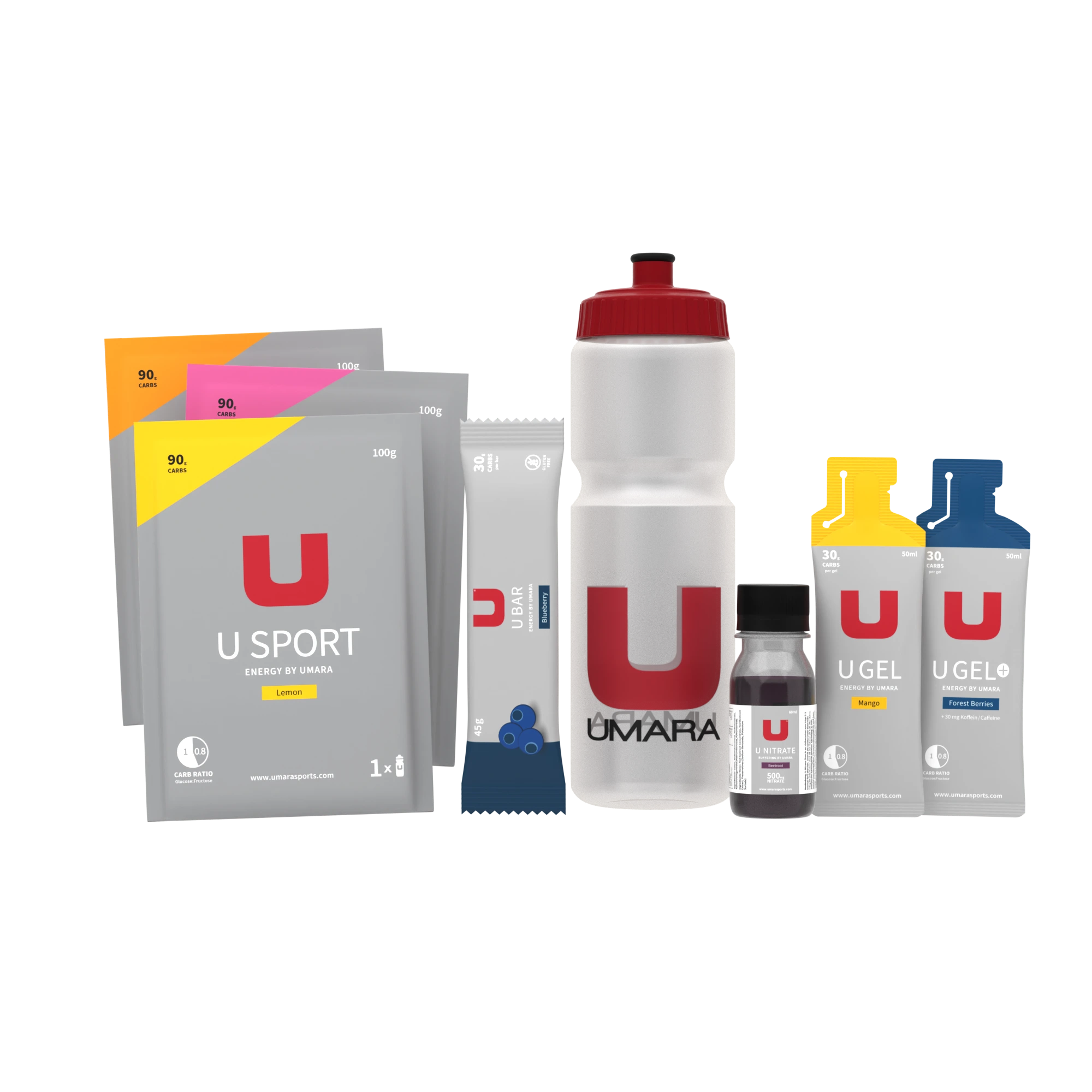 Mix 3 U Sport portions of 100g in the bottle. This provides 70g carbohydrates per hour for 4 hours. The other bottle on the frame contains plain water and can be refilled/changed at stations as needed.