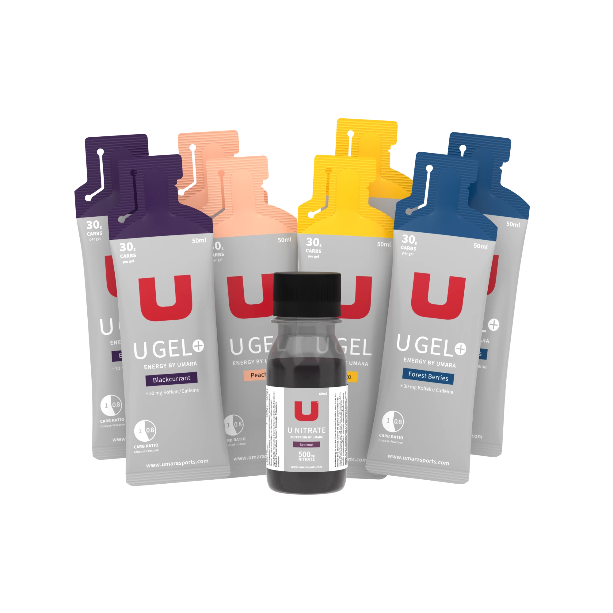 This package is tailored for a race where you also consume sports drinks from the energy stations. It ensures a steady and consistent intake of 60g of carbohydrates per hour for the duration of the race. With the addition of sports drinks/water from the stations, your intake will range between 60-90g per hour, which is awesome!