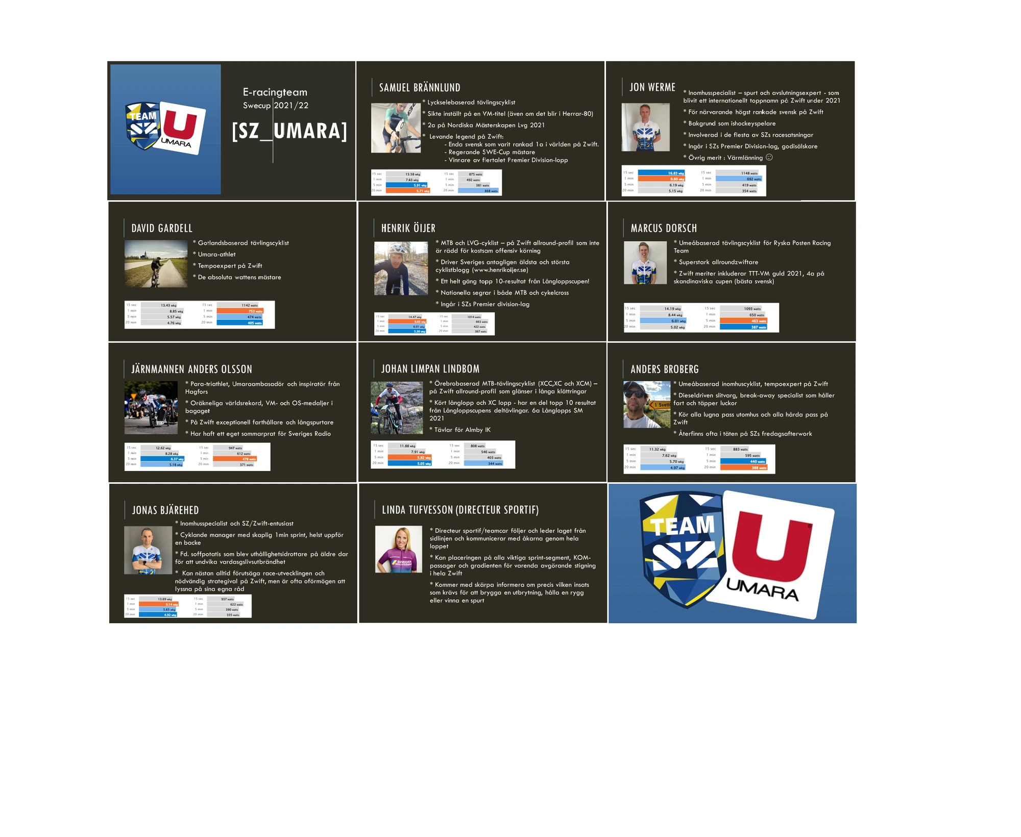 "Absolut! Team SZ är en virtuell klubb för cyklister som satsat på tävlingar i e-cykling på Zwift. Vi ställer upp i alla stora internationella tävlingsserier exempelvis Zwift racing league, lagtemposerien WTRL-TTT och andra lopp. Flera av våra åkare har exempelvis representerat Sverige i VM i e-cykling, som arrangeras av UCI i samarbete med Zwift. Swecup (som arrangeras av svenska cykelförbundet) är den största nationella tävlingsserien på Zwift och våra åkare vill såklart göra upp om vem som är bäst här på hemmaplan. Och samtidigt mäta sig mot andra svenska klubbar och cyklister som kanske just tagit steget inomhus för sin vinterträning! Under förra årets tävlingar var team SZ den klubb med överlägset störst representation i Swecup, vilket förstås är kul, men med så många åkare kan det också påverka sportsliga aspekter av tävlingen. Vi tyckte därför det skulle varar roligt att försöka sätta samman ett mindre e-racinglag för att tävla tillsammans i SweCup-serien under en annan flagg. Kanske skulle det kunna göra tävlingen roligare, både för oss som deltagare och för åskådarna? Och det skulle kanske uppmuntra andra lag och klubbar att göra på samma sätt, alltså att satsa mer som lag på e-cykling. Vi hoppas kort sagt att det ska kunna utveckla e-cyklingen i Sverige. En vision som glädjande nog delades av Umara."