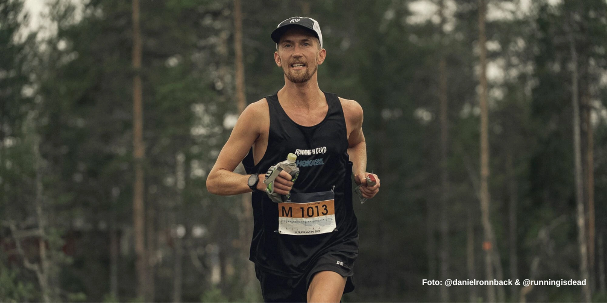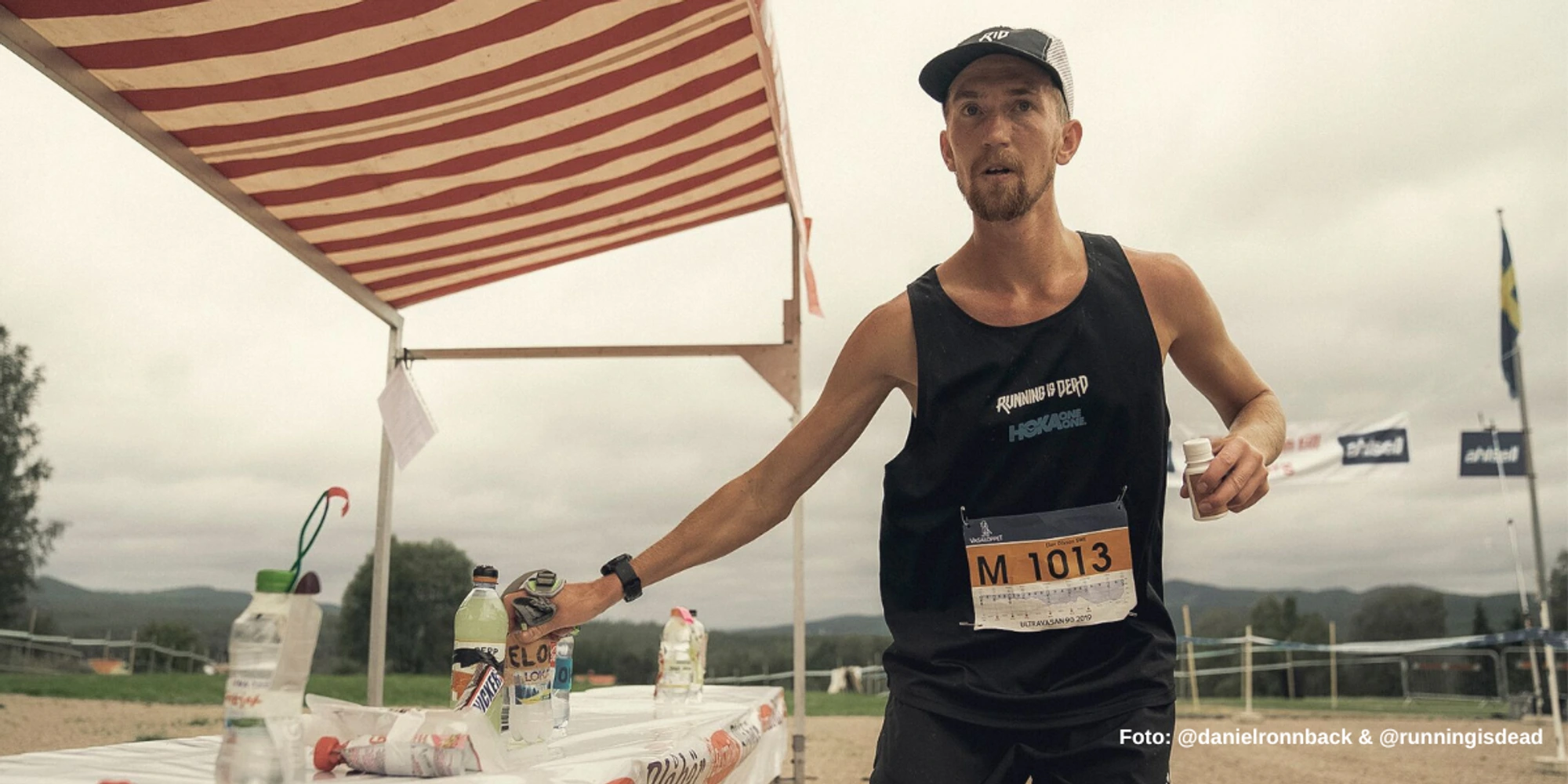 "När jag springer lopp som Ultravasan90, så brukar jag satsa på att få i mig ca 100g kolhydrater i timmen. Intaget sker oftast mellan var 25-30min. Av de bästa resultaten jag åstadkommit har jag landat mellan 79-102g. I dessa fall har energin bestått av sportdryck och gels, vilket fungerar bäst för min mage. Det kan dock vara väldigt individuellt hur mycket man klarar av och är något som kan tränas upp. Mitt tips är att varva sportdryck/gels, men viktigast är att försöka hitta ett energiintag som passar just din mage. Det är bättre att magen är lugn, så du kan få i dig energi hela loppet. Istället för att du pressar i dig för att uppnå en viss mängd, blir illamående och eventuellt måste pausa energiintaget."