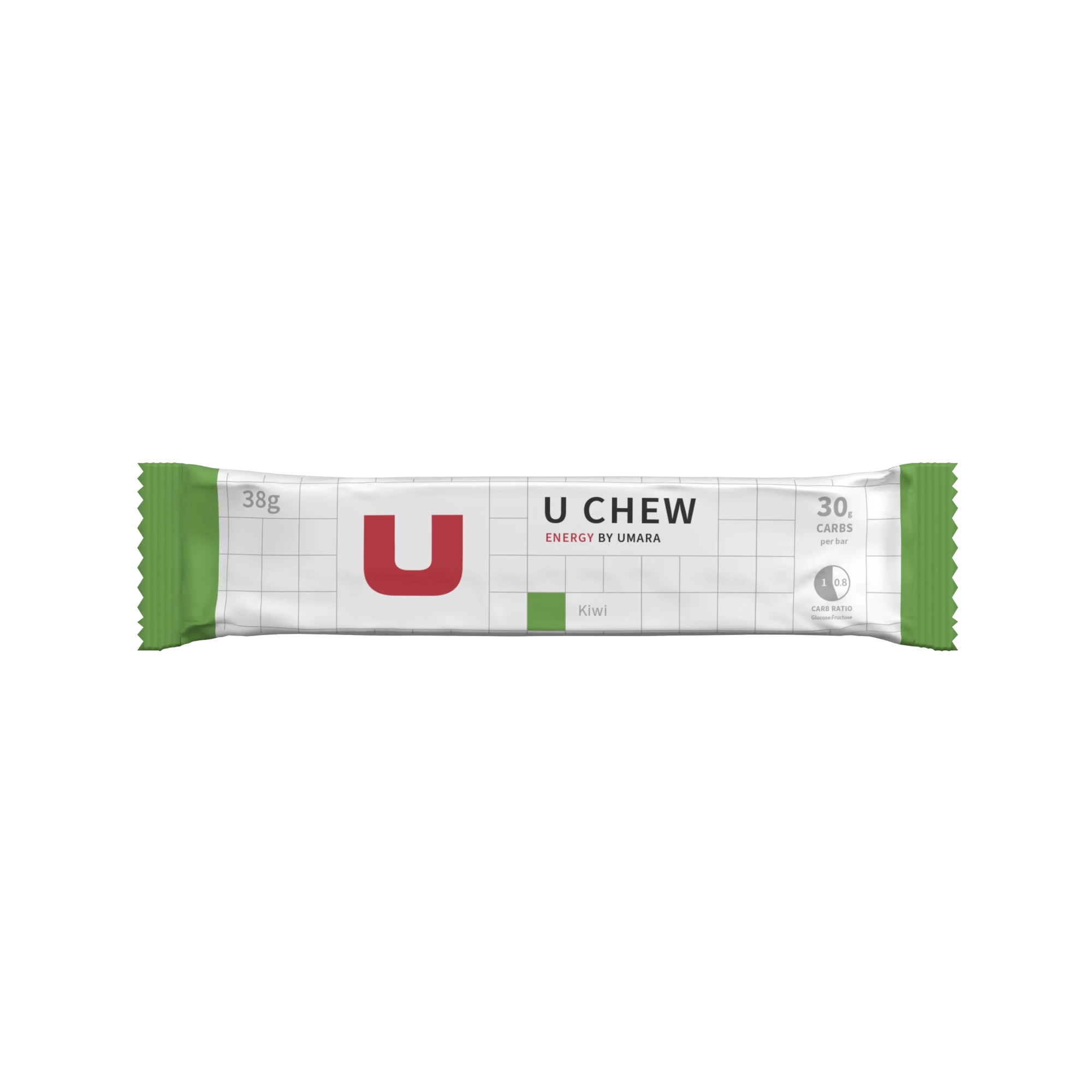 U Chew är vår "Tuggbar" eller kanske tuggbara/fasta gel. Optimerad likt våra gels med 1:0,8 kolhydratratio och salt. Upptaget av energi går lika fort som med gel så på det viset är produkterna likvärdiga men U Chew är mer fast i formen. Finns både med och utan koffein och varje U Chew ger 30g kolhydrater.