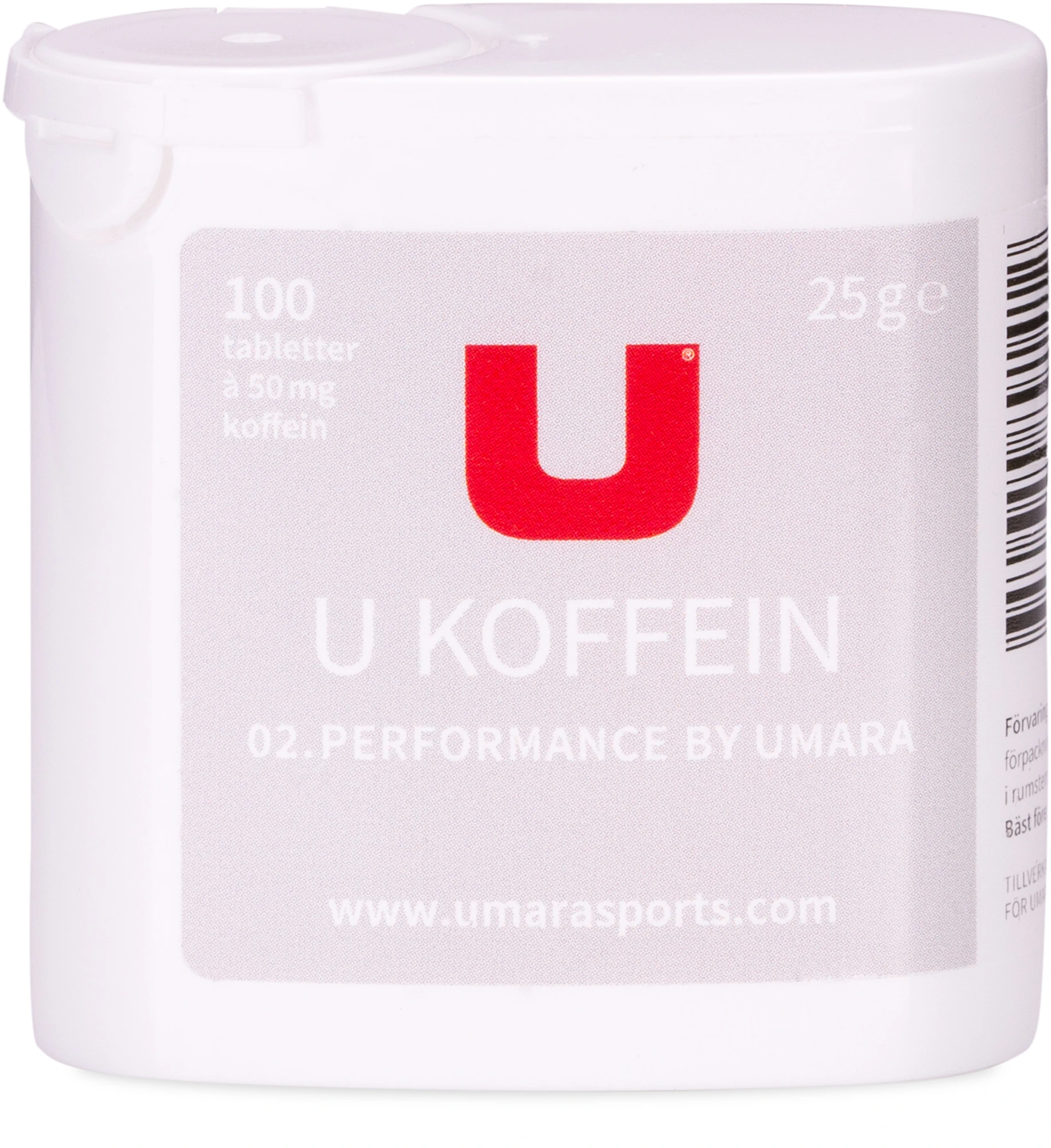 U Koffein är vår nya koffeinprodukt. Det är 100st små 50mg-koffeinpiller per burk. Upplägget innebär att du enkelt kan underhållsdosera med 1 tablett/timme under aktivitet eller ta flera stycken under eller inför om du verkligen vill kicka igång kroppen.