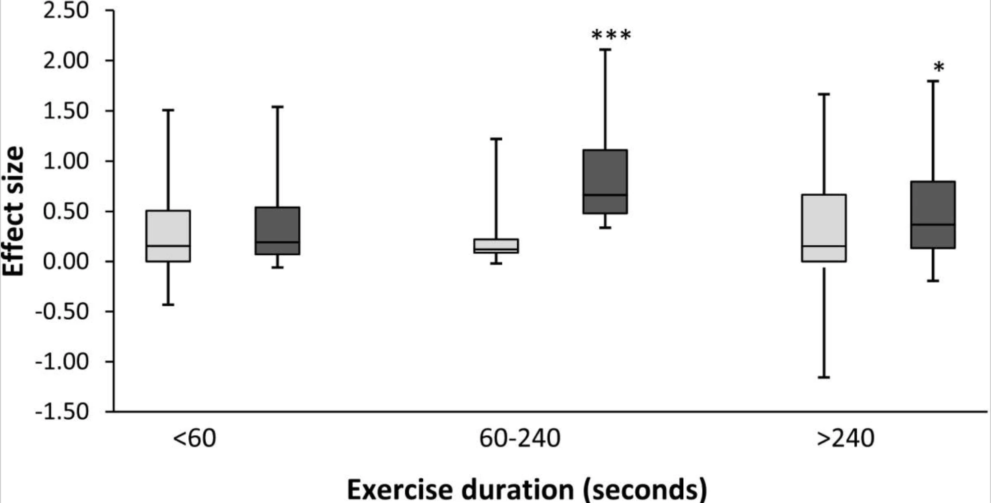Prestationsökningarna var från -0,3% upp till strax över 10%. Så vissa fick ingen effekt alls, eller till och med en liten negativ effekt, och vissa fick riktigt mycket effekt i procent. En rimlig förväntan är troligtvis i spannet om 1-5% effektökning för de flesta vid intervaller som håller på mellan 1minut upp till 8 minuter per intervall. Det verkar vara där som Beta-Alanin hjälper till som mest (se bild nedan).