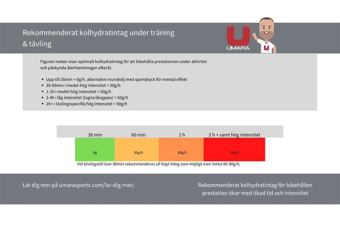 - Upp till 30min = 0g/h, alternativt munskölj med sportdryck för mental effekt
