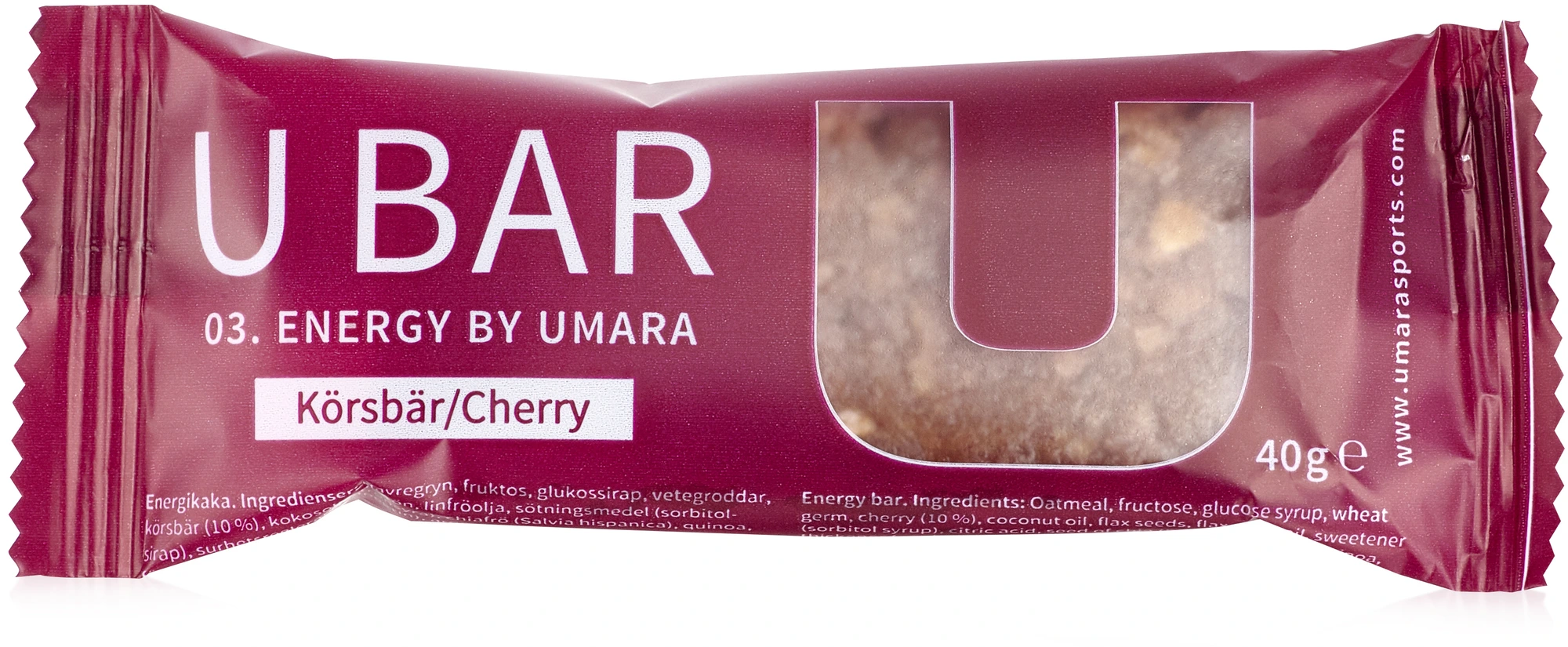 U Bar är en energibar anpassad för uthållighetsidrott i både varmt och kallt klimat. Med en bas av havregryn ger den dig en jämn energinivå över längre tid. Vi har 2gr MCT-fett (kokosolja) i baren för att hjälpa till med energitillförseln utan att påverka magen negativt. MCT-fettet gör också att baren blir mjukare i konsistensen och därmed blir lättare att konsumera när pulsen är hög.